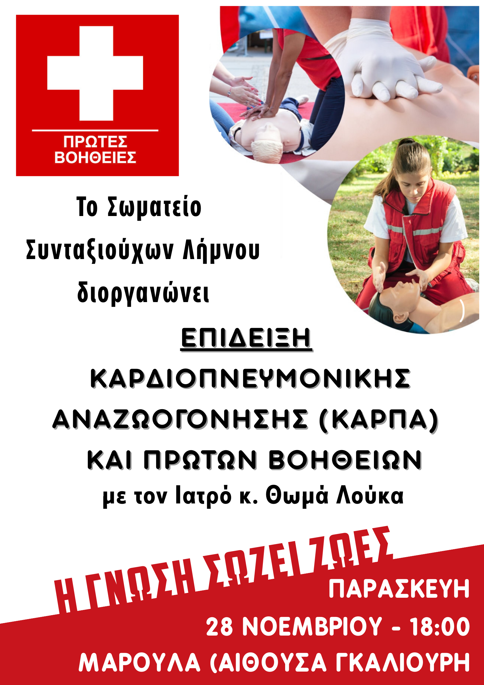 Το Σωματείο Συνταξιούχων Λήμνου διοργανώνει επίδειξη ΚΑΡΠΑ και Πρώτων Βοηθειών με τον ιατρό κ. Θωμά Λούκα, την Παρασκευή 28 Νοεμβρίου στις 18:00, στην Αίθουσα Γκαλιούρη στο Κινηματοθέατρο Μαρούλα.