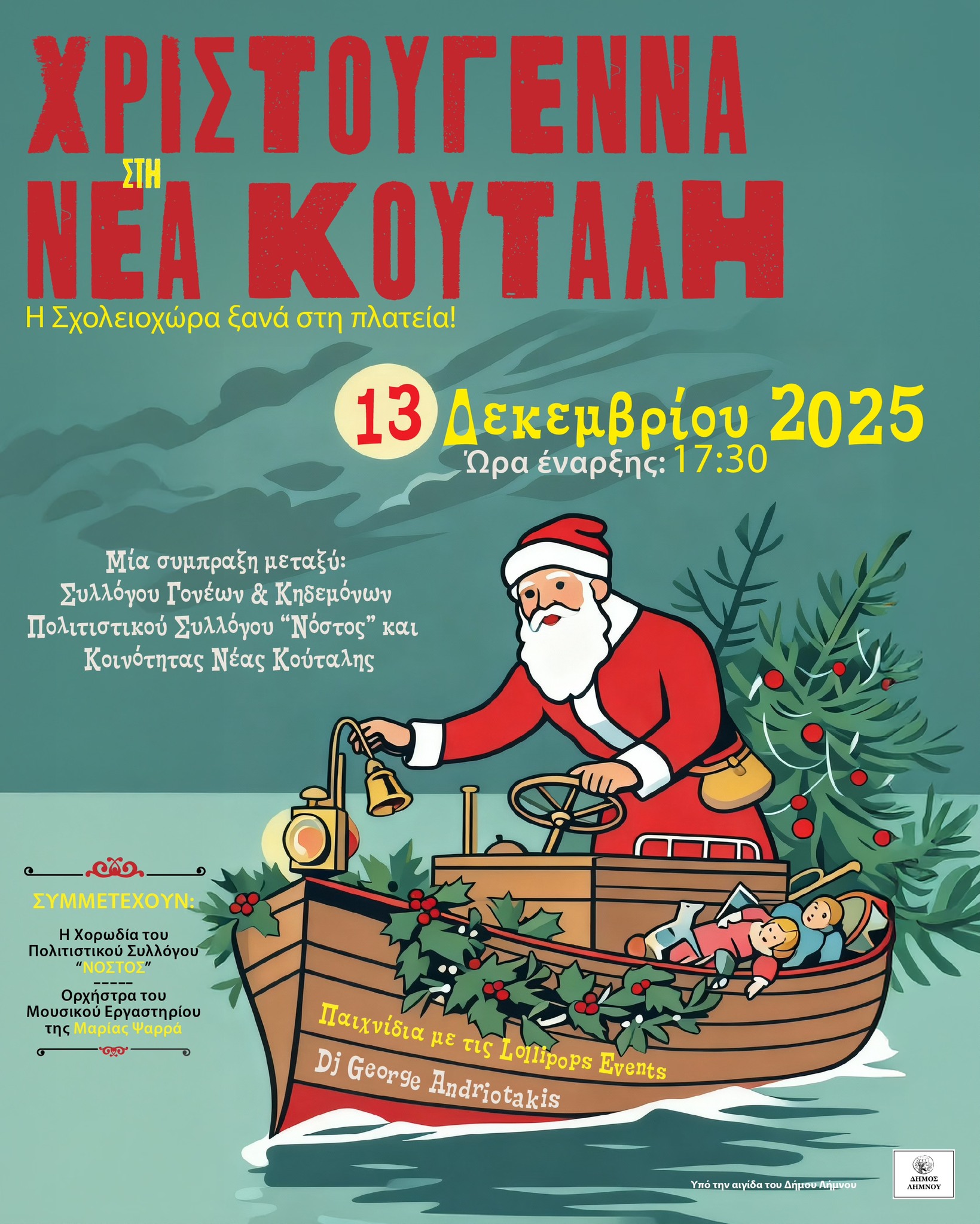 Για δεύτερη συνεχόμενη χρονιά, ο Σύλλογος Γονέων και Κηδεμόνων, ο Πολιτιστικός Σύλλογος “Νόστος” και η Κοινότητα Νέας Κούταλης, με την υποστήριξη του Δήμου Λήμνου, ενώνουν τις δυνάμεις τους και μεταφέρουν τη μαγεία της «Σχολειοχώρας» στην καρδιά του χωριού, δημιουργώντας μια αξέχαστη χριστουγεννιάτικη εμπειρία για μικρούς και μεγάλους.