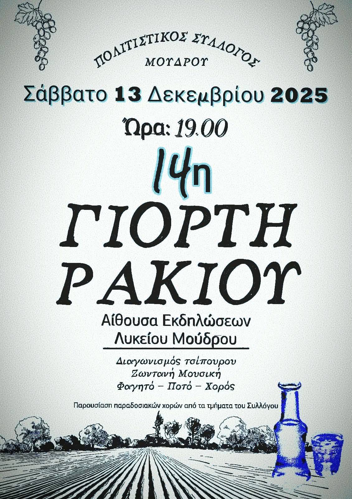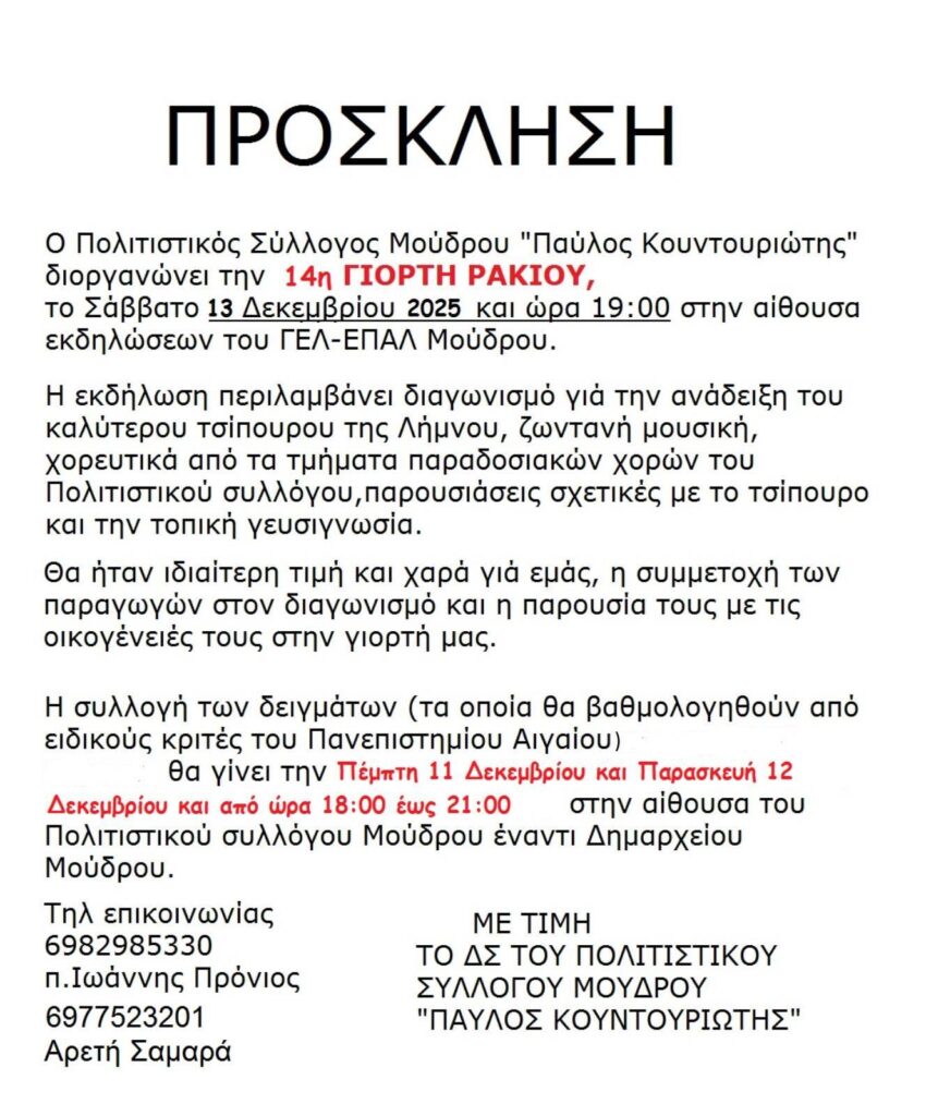 Ο Πολιτιστικός Σύλλογος Μούδρου διοργανώνει την 14η Γιορτή Ρακιού, το Σάββατο 13 Δεκεμβρίου, στις 7:00 το βράδυ, στην Αίθουσα του ΓΕΛ-ΕΠΑΛ Μούδρου.