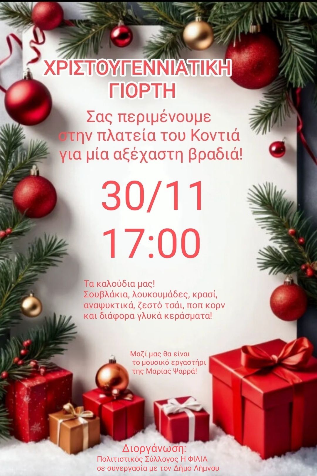 Ο Πολιτιστικός Σύλλογος Κοντιά “Η ΦΙΛΙΑ” μας προσκαλεί σε Χριστουγεννιάτικη γιορτή την Κυριακή 30 Νοεμβρίου στις 17:00, στην πλατεία του χωριού και μας υπόσχεται μια αξέχαστη βραδιά!