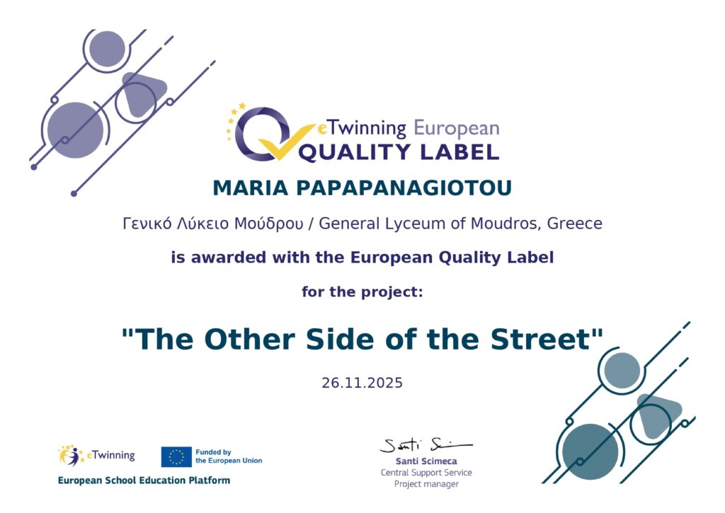Congratulations! You have been awarded the European Quality Label for the work in the eTwinning project “”The Other Side of the Street” “. This means that your work, the work of your students and the collaboration with your partners met the Quality Label Framework criteria and received a high score.