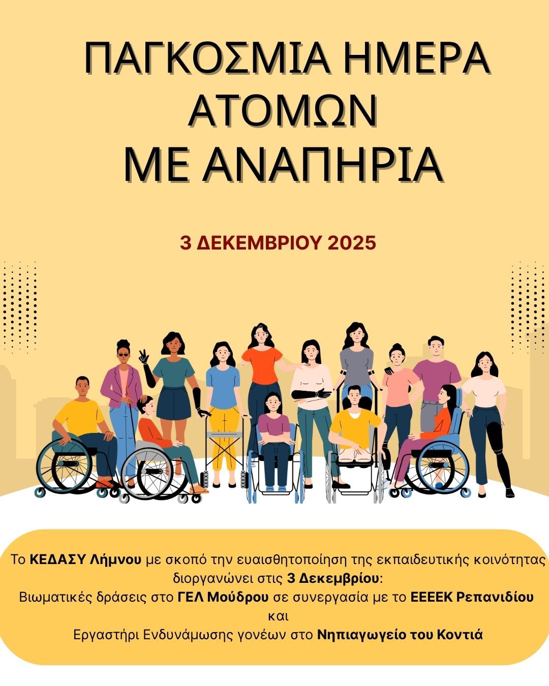 Τρεις δράσεις θα πραγματοποιηθούν στο νησί μας για την Παγκόσμια Ημέρα Ατόμων με Αναπηρία, που είναι σήμερα 3 Δεκεμβρίου.