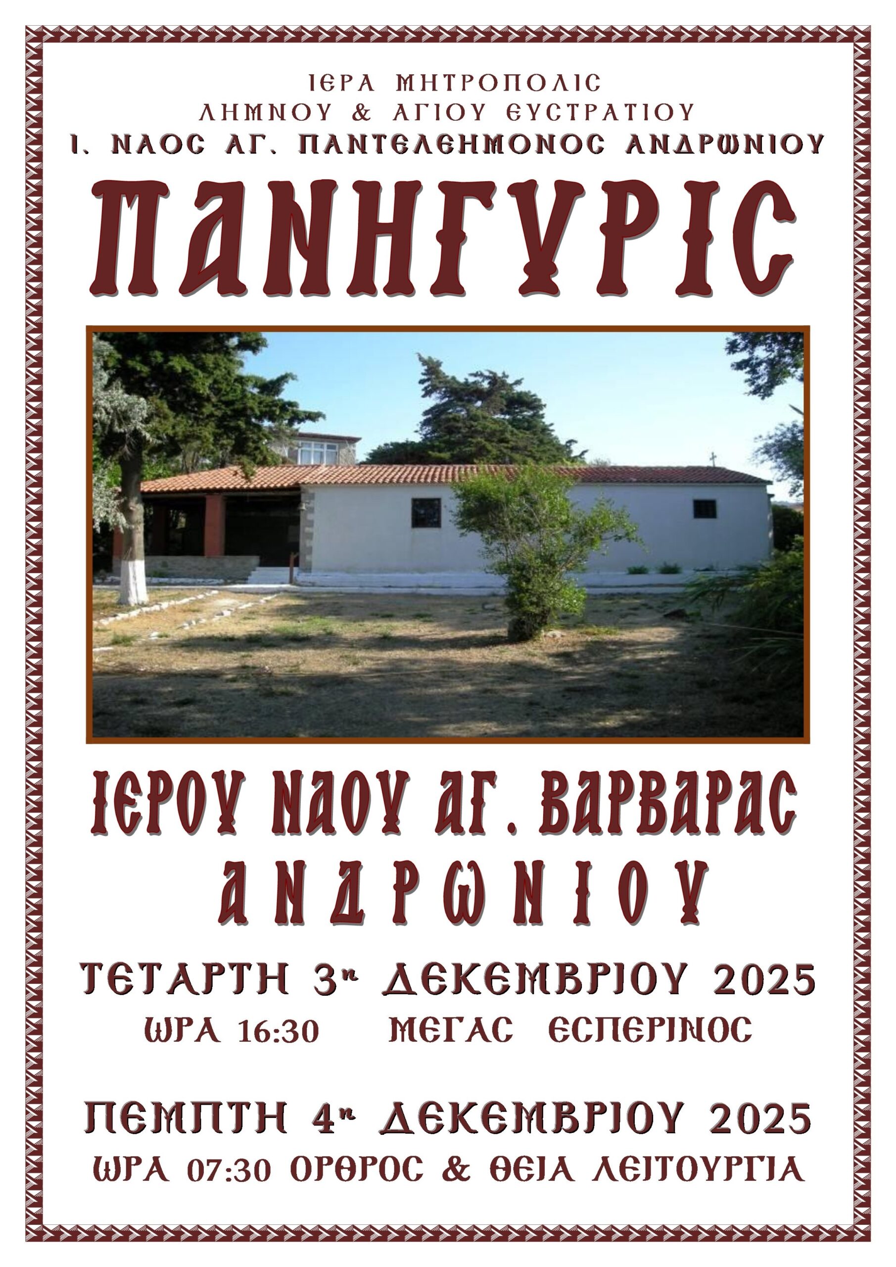 Σήμερα Τετάρτη 3 Δεκεμβρίοτ στις 16:30, ο Μέγας Εσπερινός Την Πέμπτη 4 Δεκεμβρίου στις 7:30πμ ο Όρθρος και η Θεία Λειτουργία