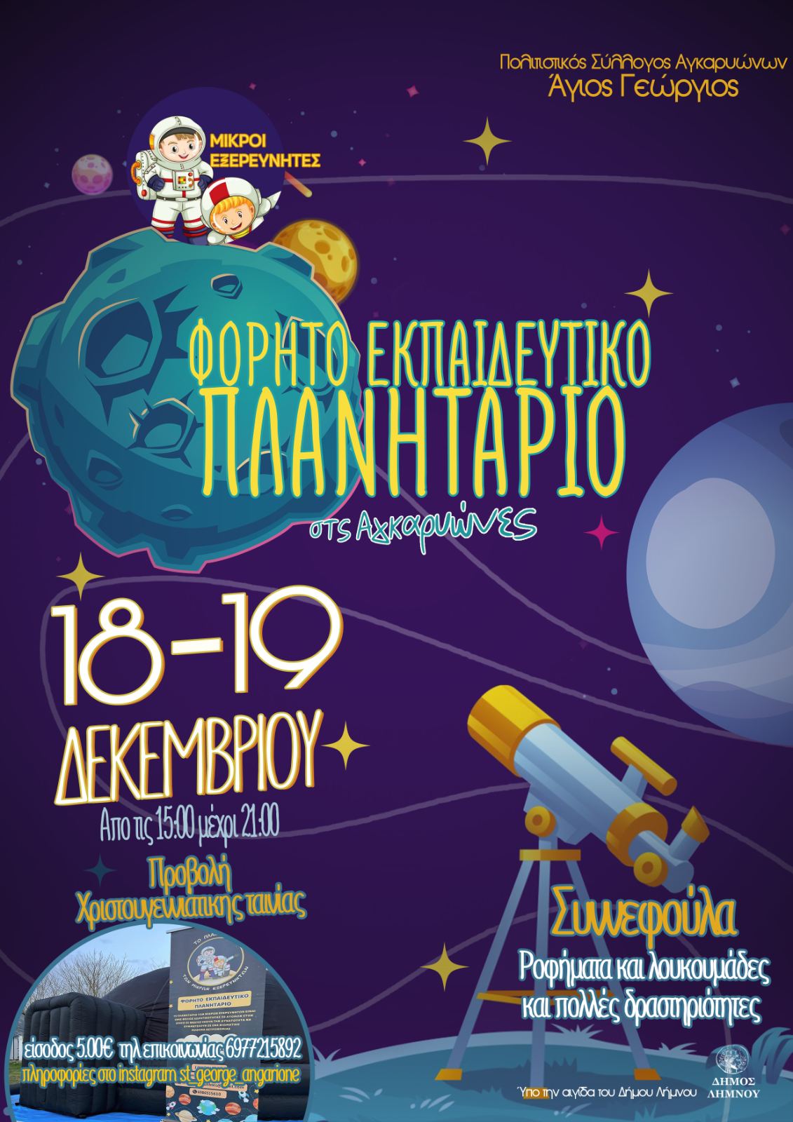 Το Φορητό Εκπαιδευτικό Πλανητάριο έρχεται για να ενθουσιάσει μικρούς και μεγάλους! Οι «Μικροί Εξερευνητές» θα ταξιδέψουν στο σύμπαν, θα παρακολουθήσουν προβολή χριστουγεννιάτικης ταινίας και θα γνωρίσουν τα μυστικά των άστρων μέσα από ένα τηλεσκόπιο, που θα μας φέρει πιο κοντά στο διάστημα!
