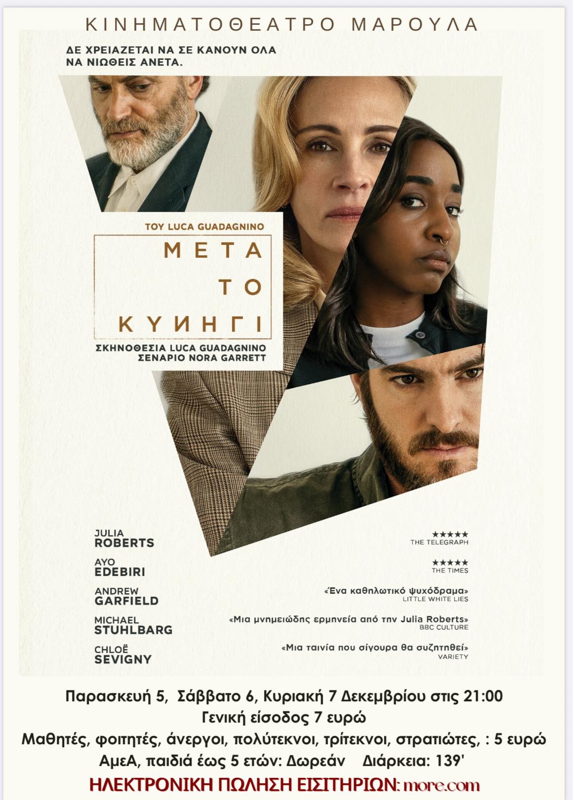 Από τον οραματιστή σκηνοθέτη Luca Guadagnino, η ταινία “Μετά το Κυνήγι” είναι ένα συγκλονιστικό ψυχολογικό δράμα με κεντρική ηρωίδα μια καθηγήτρια πανεπιστημίου (Julia Roberts), η οποία βρίσκεται σε ένα προσωπικό και επαγγελματικό σταυροδρόμι, όταν μια δημοφιλής φοιτήτρια (Ayo Edebiri) καταγγέλλει έναν από τους συναδέλφους της (Andrew Garfield), και ένα σκοτεινό μυστικό από το δικό της παρελθόν απειλεί να έρθει στο φως.