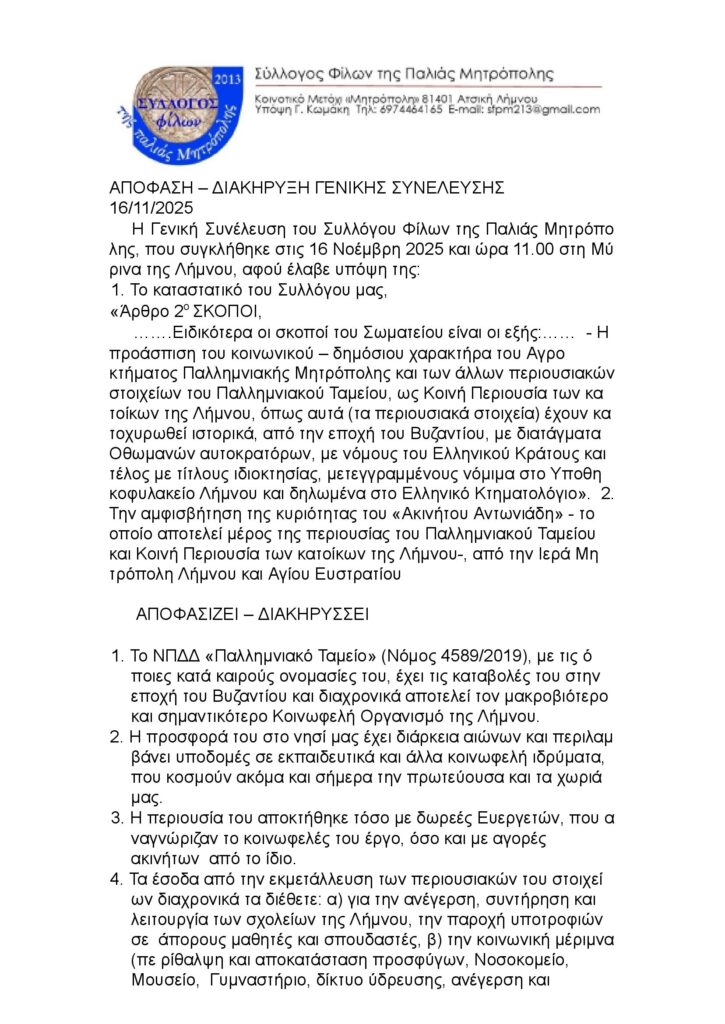 Η Γενική Συνέλευση του Συλλόγου Φίλων της Παλιάς Μητρόπολης, που συγκλήθηκε στις 16 Νοέμβρη 2025 και ώρα 11.00 στη Μύρινα της Λήμνου, αφού έλαβε υπόψη της: