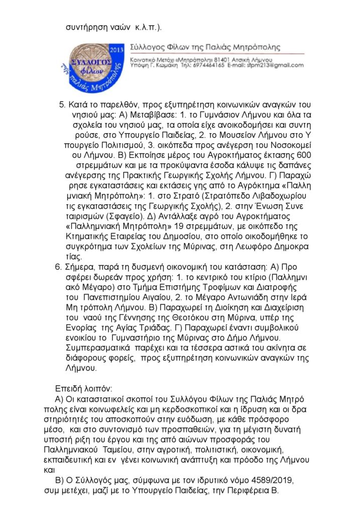 …….Ειδικότερα οι σκοποί του Σωματείου είναι οι εξής:…… – Η προάσπιση του κοινωνικού – δημόσιου χαρακτήρα του Αγροκτήματος Παλλημνιακής Μητρόπολης και των άλλων περιουσιακών στοιχείων του Παλλημνιακού Ταμείου, ως Κοινή Περιουσία των κατοίκων της Λήμνου, όπως αυτά (τα περιουσιακά στοιχεία) έχουν κατοχυρωθεί ιστορικά, από την εποχή του Βυζαντίου, με διατάγματα Οθωμανών αυτοκρατόρων, με νόμους του Ελληνικού Κράτους και τέλος με τίτλους ιδιοκτησίας, μετεγγραμμένους νόμιμα στο Υποθηκοφυλακείο Λήμνου και δηλωμένα στο Ελληνικό Κτηματολόγιο».