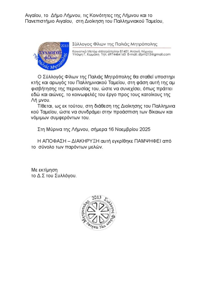 Ο Σύλλογός Φίλων της Παλιάς Μητρόπολης θα σταθεί υποστηρικτής και αρωγός του Παλλημνιακού Ταμείου, στη φάση αυτή της αμφισβήτησης της περιουσίας του, ώστε να συνεχίσει, όπως πράττει εδώ και αιώνες, το κοινωφελές του έργο προς τους κατοίκους της Λήμνου.