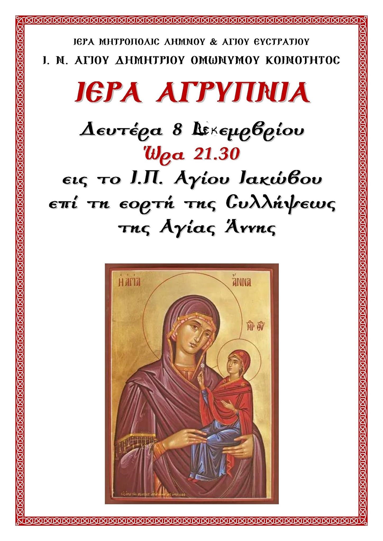Ιερά Αγρυπνία θα τελεστή σήμερα Δευτέρα 8 Νοεμβρίου, στις 21:30 στο Ιερό παρεκκλήσιο του Αγίου Ιακώβου, στον Άγιο Δημήτριο, για την εορτή της Συλλήψεως της Αγίας Άννης.