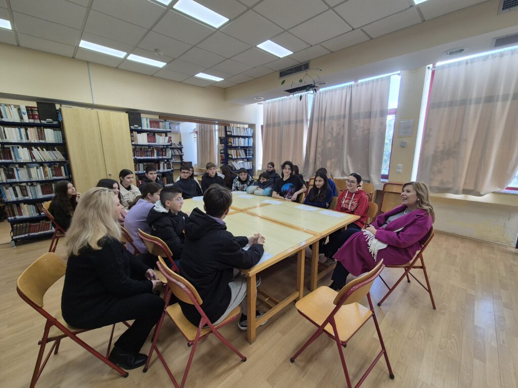 Στο σχολείο την υποδέχθηκε η Διευθύντρια, κ. Θεοδώρα Λυμπέρη και τη συζήτηση συντόνισαν οι εκπαιδευτικοί-συνοδοί των παιδιών στο συνέδριο, κ. Κρυστάλλω Πάντσιου, καθηγήτρια Γερμανικής Γλώσσας και κ. Χρυσούλα Μέρμηγκα, καθηγήτρια Αγγλικής Γλώσσας.