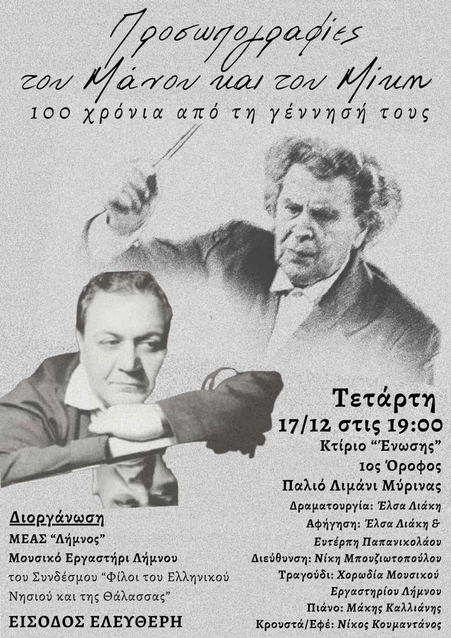 Ο ΜΕΑΣ Λήμνος, σε συνεργασία με το Μουσικό Εργαστήρι Λήμνος παρουσιάζουν την εκδήλωση με τίτλο «Προσωπογραφίες του Μάνου και του Μίκη – 100 χρόνια από την γέννησή τους». Τετάρτη, 17 Δεκεμβρίου και ώρα 19:00, στον πολυχώρο πολιτισμού του ΜΕΑΣ Λήμνος, στη Μύρινα.