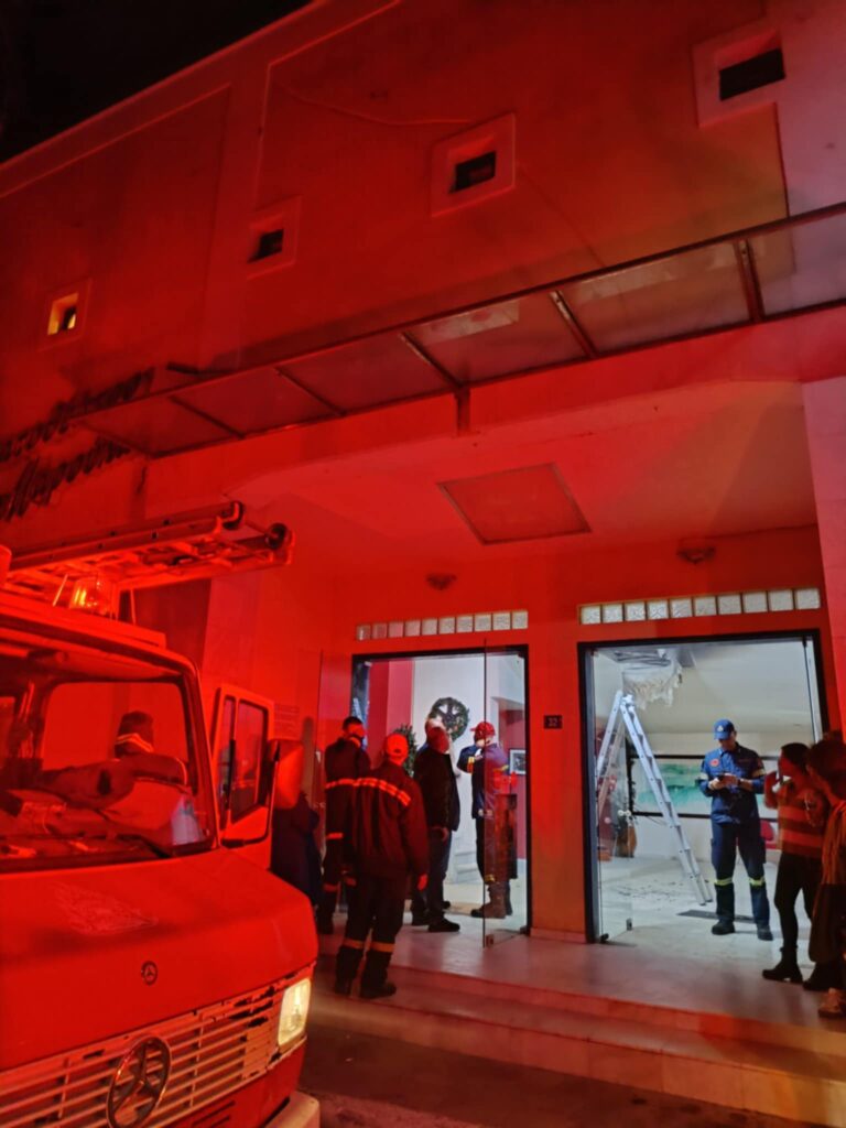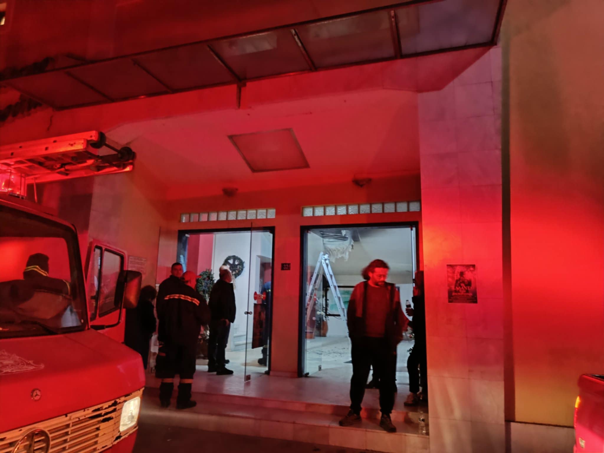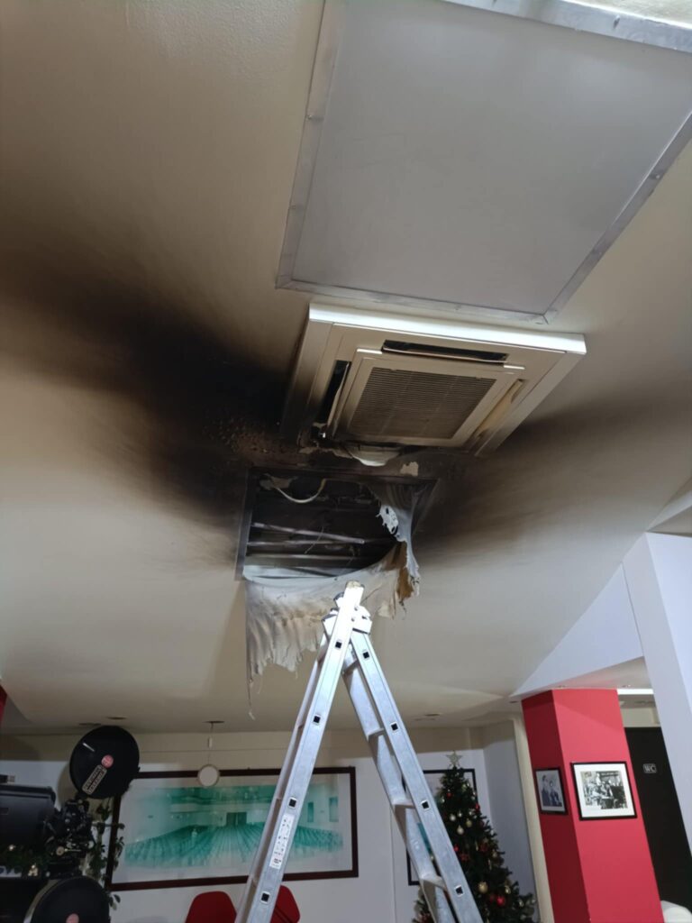 Η ζημιά είναι σε φωτιστικό στο φουαγιέ του χώρου, δίπλα στο κλιματιστικό, πιθανώς από κάποιο βραχυκύκλωμα που έγινε σε λαμπτήρα.