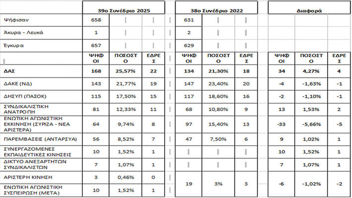 Η ΔΑΣ, που το ψηφοδέλτιό της συγκροτείται με συνδικαλιστές που συσπειρώνονται στο Π.Α.ΜΕ. με μεγάλη άνοδο σε ψήφους, ποσοστά και έδρες – από 134 ψήφους, 21,3% και 18 έδρες το 2022 σε 168 ψήφους, 22 έδρες και 25,57% – αναδείχθηκε πρώτη δύναμη γκρεμίζοντας την κυβερνητική παράταξη της ΔΑΚΕ από αυτή τη θέση.