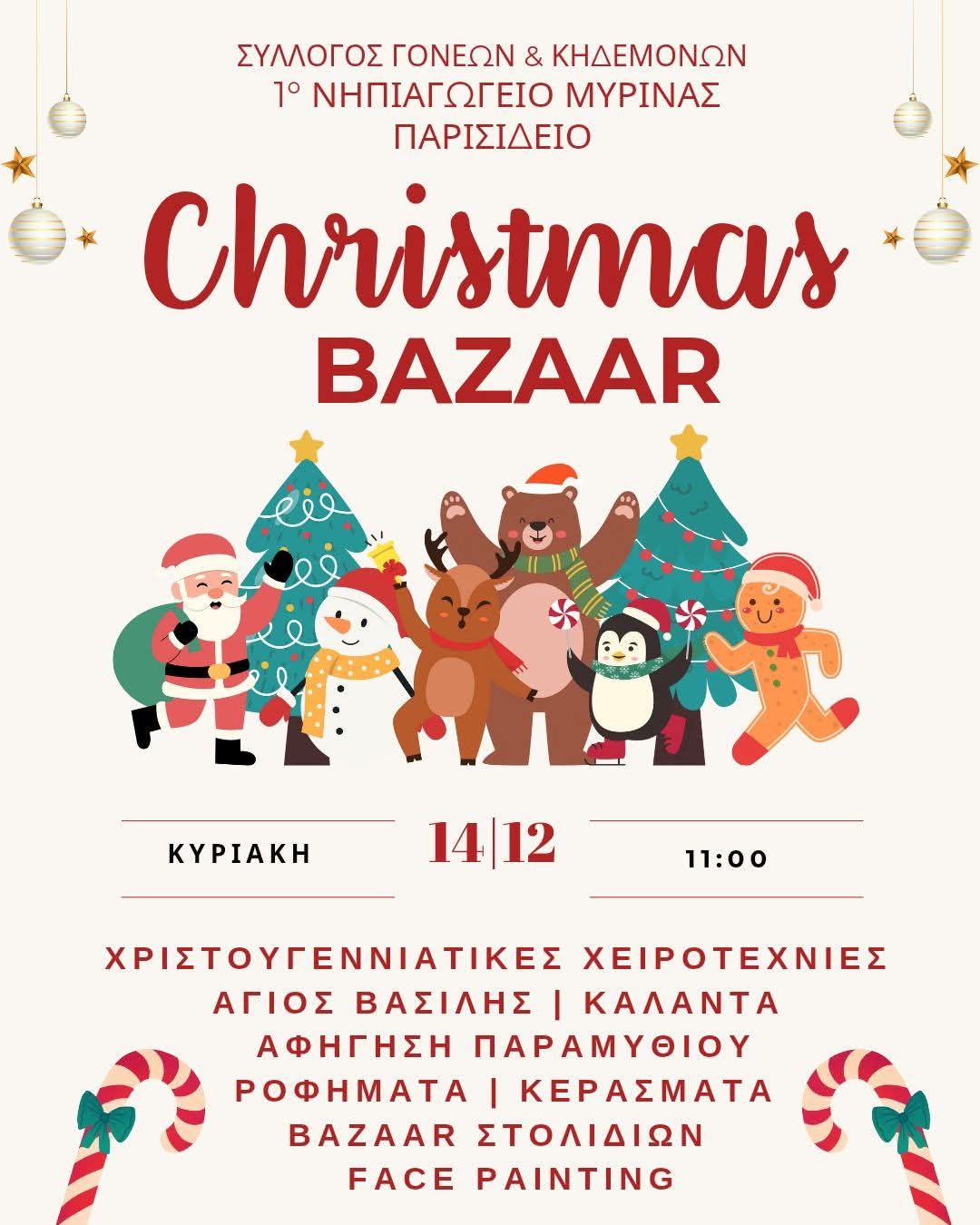Ο Σύλλογος Γονέων και Κηδεμόνων του 1ου Νηπιαγωγείου της Μύρινας μας προσκαλεί στο Χριστουγεννιάτικο Μπαζάρ του, την Κυριακή 14 Δεκεμβρίου, στις 11:00 το πρωί.