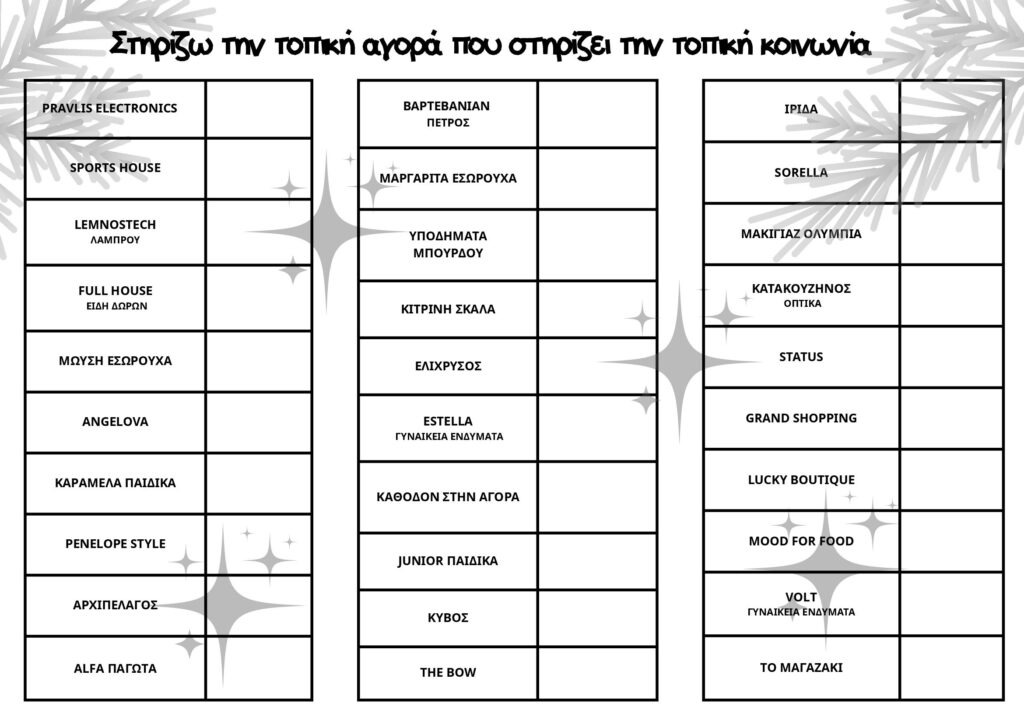 Οι καταστηματάρχες στην αγορά που στηρίζουν όλο αυτό τον καιρό την τοπική κοινωνία συνδράμοντας πάντα με όποιο τρόπο μπορούν στις κοινωνικές εκδηλώσεις συλλόγων και φορέων, προσκαλούν τους φίλους και συμπολίτες τους φέτος να προτιμήσουν την τοπική αγορά για τα ψώνια των γιορτών.