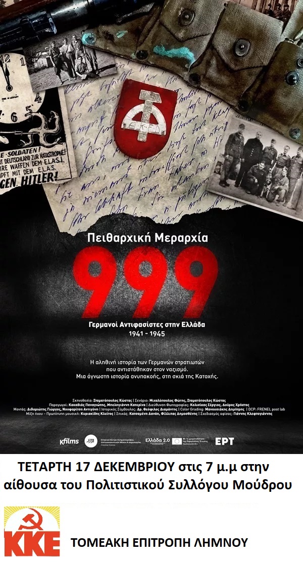 Μετά την επιτυχή προβολή του στη Μύρινα,καλούμε όλες και όλους στην εκδήλωση και προβολή του ντοκιμαντέρ «Πειθαρχική Μεραρχία 999 – Γερμανοί Αντιφασίστες στην Ελλάδα 1941-1945», με αναφορά και στη Λήμνο και στο Μούδρο, την Τετάρτη 17 Δεκεμβρίου στις 7 μ.μ. στην αίθουσα του Πολιτιστικού Συλλόγου Μούδρου.