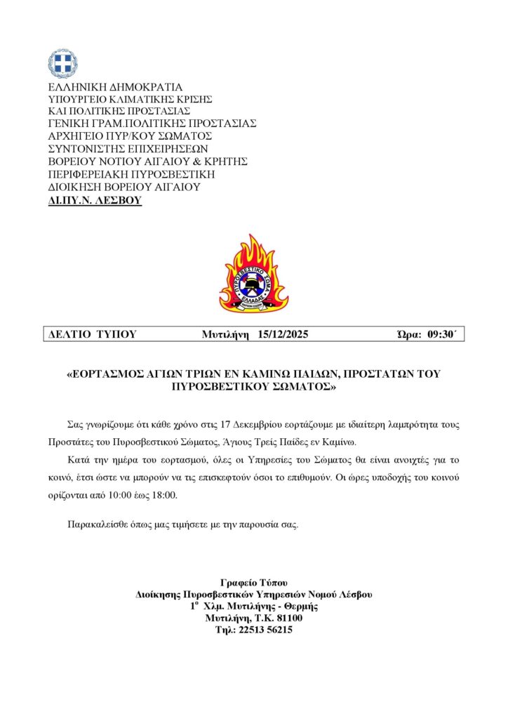 Οι Τρεις Παίδες Εν Καμίνω, οι προστάτες του Πυροσβεστικού Σώματος γιορταζουν 17 Δεκεμβρίου.