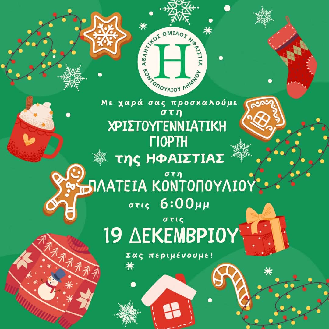 Την 19η Δεκεμβρίου στις 18:00 μ.μ., η Ηφαιστία διοργανώνει μια γιορτή γεμάτη χαρά, μουσική και γιορτινή ατμόσφαιρα στην Πλατεία Κοντοπουλίου!