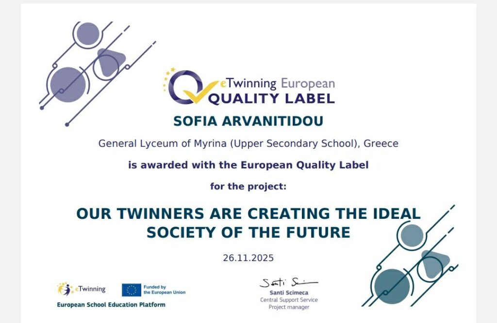 Παράλληλα, το eTwinning έργο «Our Twinners are creating the Ideal Society of the future», που υλοποιήθηκε πέρσι με μαθητές της Α’ Λυκείου υπό τον συντονισμό της εκπαιδευτικού Αγγλικής Φιλολογίας Σοφίας Αρβανιτίδου και πρέσβειρας eTwinning Βορείου Αιγαίου, απέσπασε την Ευρωπαϊκή Ετικέτα Ποιότητας (European Quality Label). Πρόκειται για μια σημαντική διάκριση σε ευρωπαϊκό επίπεδο, με πολύ υψηλή βαθμολογία, που δείχνει τη συνέργεια, τη δημιουργικότητα και την και την άριστη συνεργασία του ΓΕΛ Μύρινας με τα σχολεία των Ευρωπαίων εταίρων. Το έργο δεν ήταν μόνο μια ευκαιρία για μάθηση και χρήση ψηφιακών εργαλείων, αλλά και μια εμπειρία ενεργούς πολιτειότητας (active citizenship). Μέσα από την επικοινωνία με μαθητές άλλων χωρών, καλλιεργήθηκε η αίσθηση της ευρωπαϊκής ταυτότητας και της συλλογικής υπευθυνότητας.