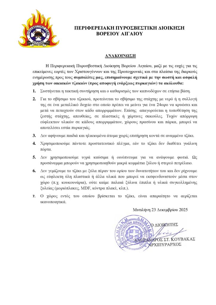 Με αφορμή την εορταστική περίοδο, η Περιφερειακή Πυροσβεστική Διοίκηση Βορείου Αιγαίου μαζί με τις ευχές της ενημερώνει για τους κανόνες για την ασφαλή χρήση του τζακιού, έτσι ώστε οι πολίτες να είναι προσεχτικοί και να αποφύγουν την πιθανότητα φωτιά και ατυχημάτων στο σπίτι.