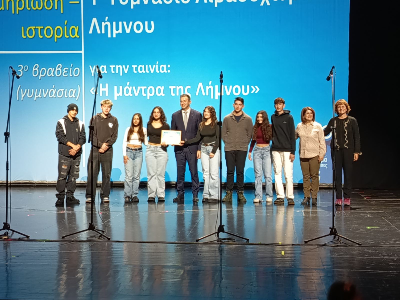Στην κατηγορία Ντοκιμαντέρ Γυμνασίων (Ταινία Τεκμηρίωσης) με την ταινία «Η Μάντρα της Λήμνου» το ΓυμνάσιοΛιβαδοχωρίου παρέλαβε από τον Γενικό Γραμματέα Επικοινωνίας και Ενημέρωσης κ. Δημήτρη Κιρμικίρογλου το 3ο Βραβείο.
