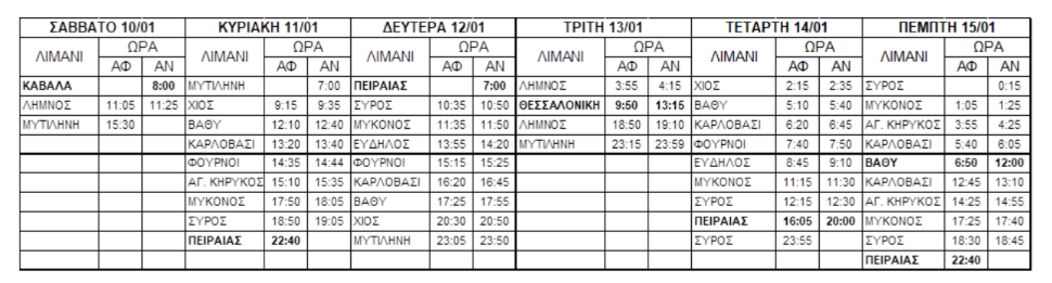Σας ενημερώνουμε ότι σύμφωνα με τελευταία δελτία της ΕΜΥ, προβλέπονται εκ νέου δυσμενείς καιρικές συνθήκες το Σάββατο 10/01/2026, ως εκ τούτου το πλοίο Blue Star Myconos προερχόμενο από Καβάλα, θα παραμείνει στο ασφαλές λιμάνι της Μυτιλήνης το Σάββατο 10/01/2026 μέχρι την βελτίωση των καιρικών συνθηκών, επομένως τα δρομολόγια του μέχρι τη Πέμπτη 15/01/2026, θα διαμορφωθούν σύμφωνα με τον παρακάτω πίνακα: