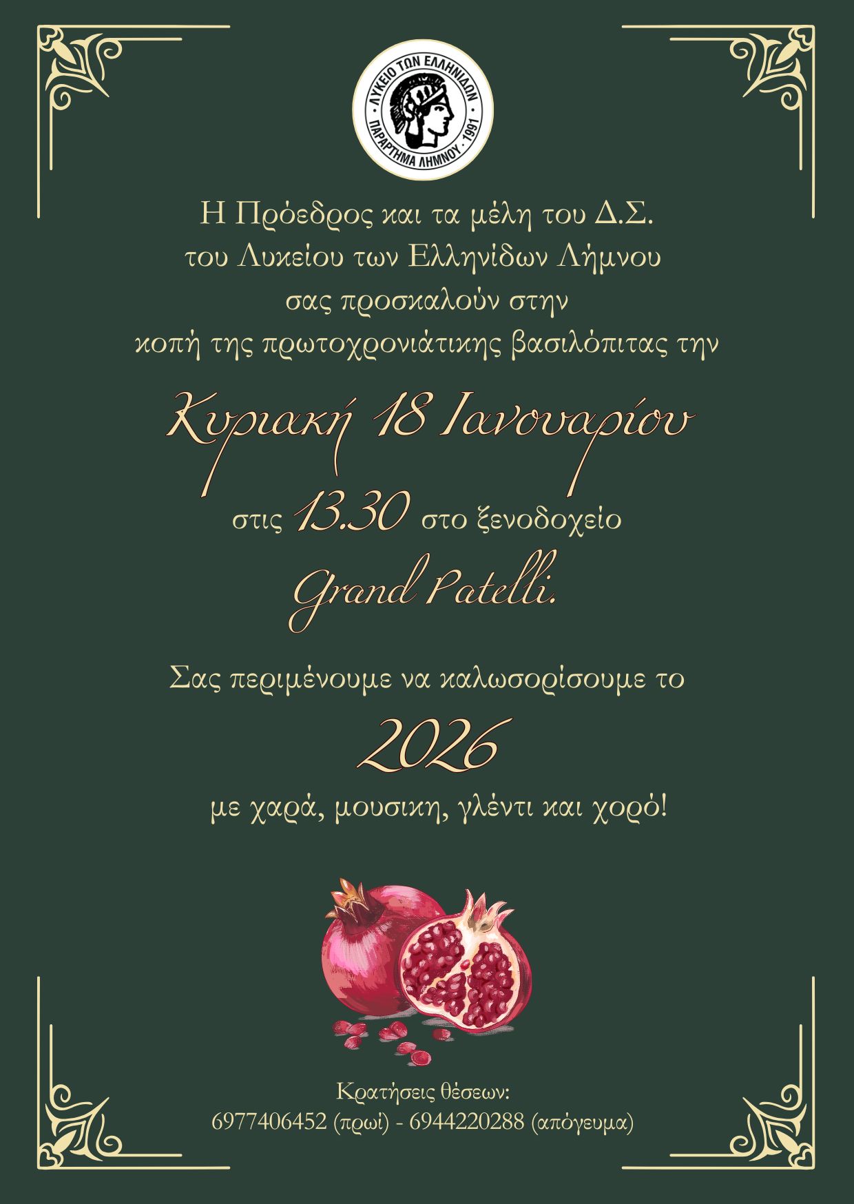 Η Πρόεδρος και τα μέλη του Δ.Σ. του Λυκείου των Ελληνίδων Λήμνου, σας προσκαλούν την Κυριακή 18 Ιανουαρίου 2026, στις 13:30 στο ξενοδοχείο Grand Patelli για την κοπή της Πρωτοχρονιάτικης βασιλόπιτας. Σας περιμένουμε για να καλωσορίσουμε μαζί το 2026!