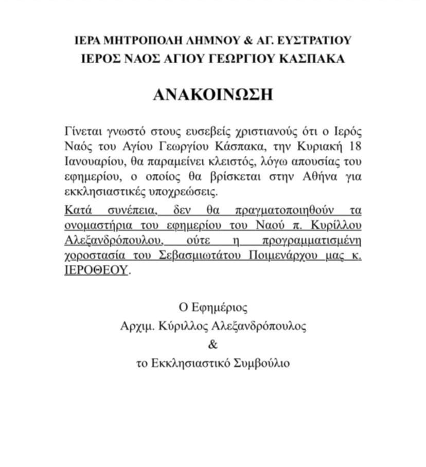 ΚΛΕΙΣΤΟΣ ΣΤΙΣ 18 ΙΑΝΟΥΑΡΙΟΥ Ο ΙΕΡΟΣ ΝΑΟΣ ΑΓΙΟΥ ΓΕΩΡΓΙΟΥ ΚΑΣΠΑΚΑ