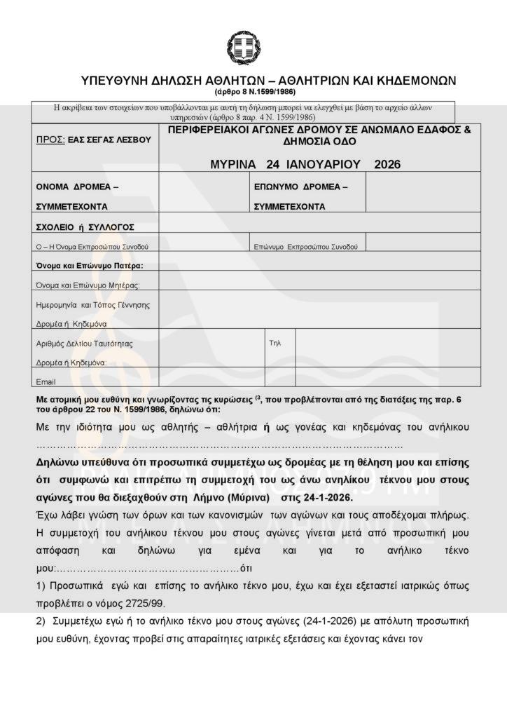 Επισυνάπτουμε συνημμένα έντυπο υπεύθυνης δήλωσης για την οποία και παρακαλούμε, οι συμμετέχοντες ανεξάρτητοι αθλητές-τριες , που δεν έχουν εκδώσει αθλητικό δελτίο από τον ΣΕΓΑΣ-ΕΑΣ, να την έχουν συμπληρωμένη – υπογεγραμμένη από πριν και να την παραδίδουν στην αίθουσα κλήσης.