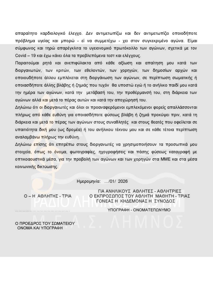 Σε αντίθετη περίπτωσηπρέπει απαραίτητα να καταθέσουν στην αίθουσα κλήσης «ΥΠΕΥΘΥΝΗ ΔΗΛΩΣΗ» ότι έχουν εξεταστεί από ιατρό και συμμετέχουν στους αγώνες αποκλειστικά με δική τους ευθύνη , οι άνω των 18 ετών οι ίδιοι ή των γονέων τους οι ανήλικοι.