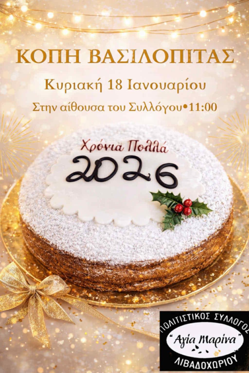 Ο Πολιτιστικός Σύλλογος Λιβαδοχωρίου «Η Αγία Μαρίνα» σας προσκαλεί στην κοπή της βασιλόπιτας για τη νέα χρονιά!