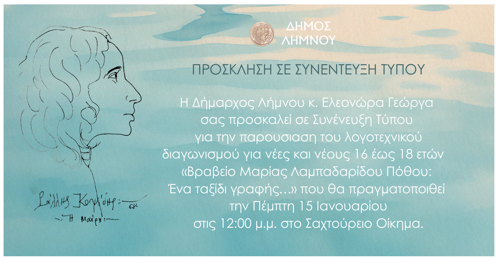 Η δήμαρχος Λήμνου κ. Ελεονώρα Γεώργα προσκαλεί τα ΜΜΕ σε συνέντευξη τύπου για την παρουσίαση λογοτεχνικού Διαγωνισμού για νέους και νέες, αφιερωμένου στη μνήμη της Λημνιάς συγγραφέως Μαρίας Λαμπαδαρίδου Πόθου”.