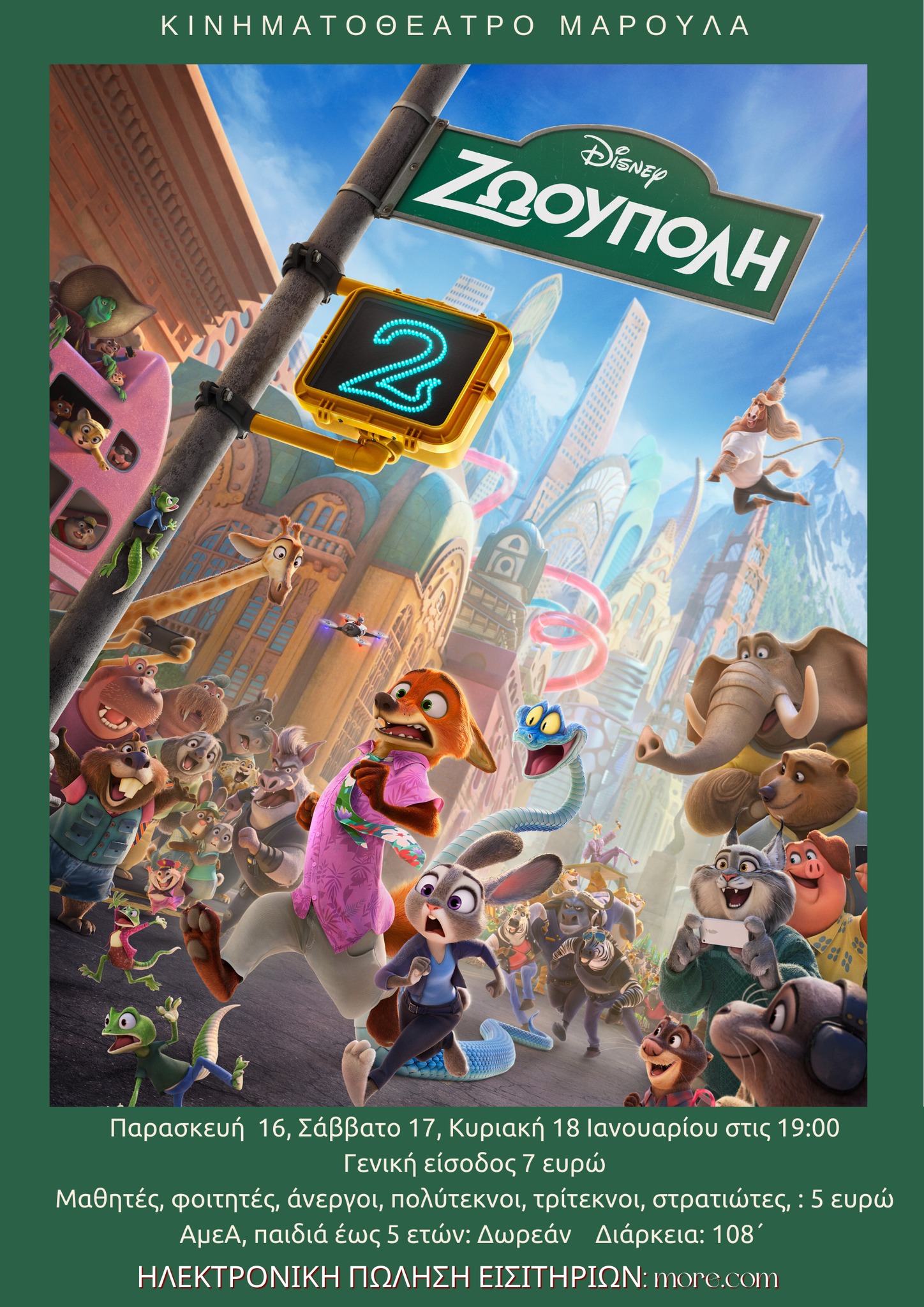Στη νέα ταινία κινουμένων σχεδίων «Ζωούπολη 2» των Walt Disney Animation Studios, οι ντετέκτιβ Τζούντι Χοπς (με τη φωνή της Ginnifer Goodwin) και Νικ Γουάιλντ (με τη φωνή του Jason Bateman) βρίσκονται στα ίχνη ενός μυστηριώδους ερπετού που φτάνει στη Ζωούπολη και φέρνει τα πάνω κάτω στη μητρόπολη των ζώων. Για να λύσουν την υπόθεση, η Τζούντι και ο Νικ πρέπει να πάνε μυστικά σε απροσδόκητα νέα μέρη της πόλης, όπου η συνεργασία τους δοκιμάζεται όσο ποτέ άλλοτε.