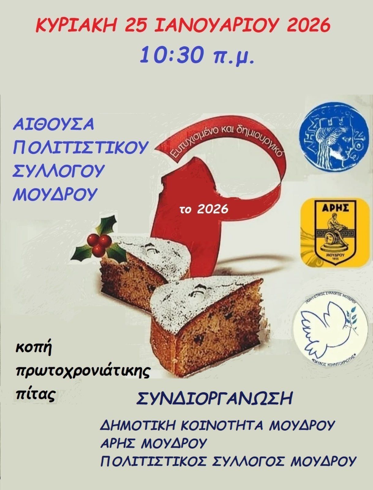 Η Δημοτική Κοινότητα Μούδρου Συνδιοργανώνει με τον Πολιτιστικό Σύλλογο Μούδρου ´Παύλος Κουντουργιώτης ´ και τον Αθλητικό Σύλλογο ΑΡΗΣ ΜΟΥΔΡΟΥ την κοπή της Πίτας του 2026.