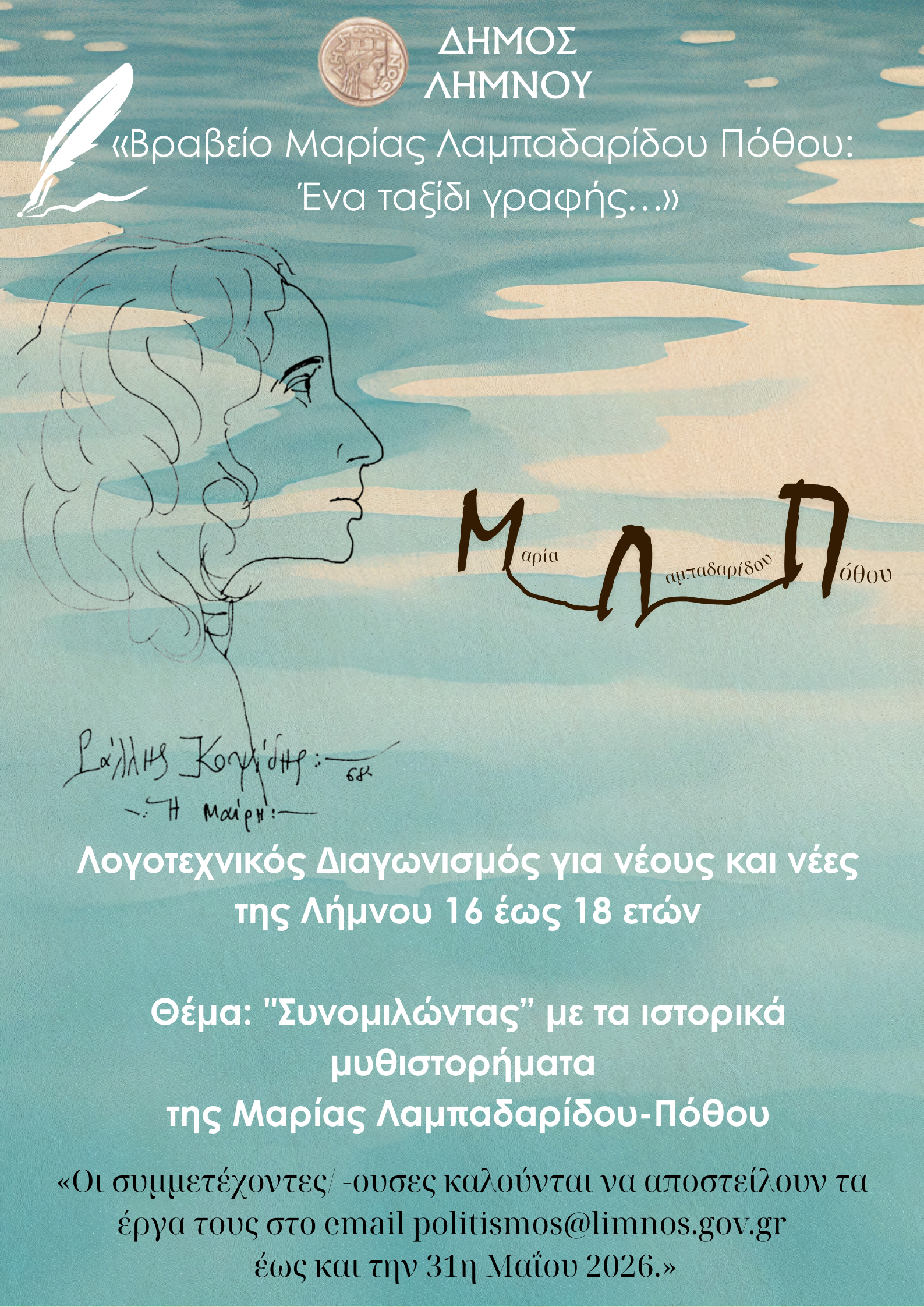 Στο πλαίσιο της αναγνώρισης της προσφοράς της Λημνιάς συγγραφέα Μαρίας Λαμπαδαρίδου Πόθου, της οποίας το έργο αποτελεί ανεξάντλητη πηγή δημιουργικής έμπνευσης, ο Δήμος Λήμνου προκηρύσσει Λογοτεχνικό Διαγωνισμό στη μνήμη της με τίτλο: