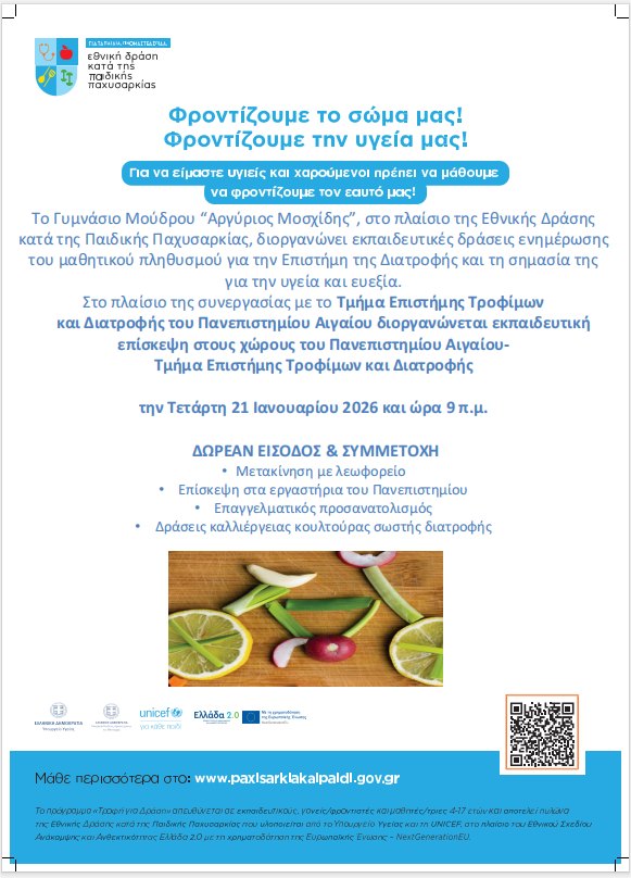 και Διατροφής του Πανεπιστημίου Αιγαίου διοργανώνεται εκπαιδευτική επίσκεψη στους χώρους του Πανεπιστημίου Αιγαίου-Τμήμα Επιστήμης Τροφίμων και Διατροφής Department of Food Science and Nutrition – UoA την Τετάρτη 21 Ιανουαρίου 2026 και ώρα 9 π.μ. με ξενάγηση και ενημέρωση στα εργαστήρια του Πανεπιστημίου για τον επαγγελματικό προσανατολισμό της Γ΄ τάξης του σχολείου μας και την καλλιέργεια κουλτούρας για τη σωστή διατροφή.