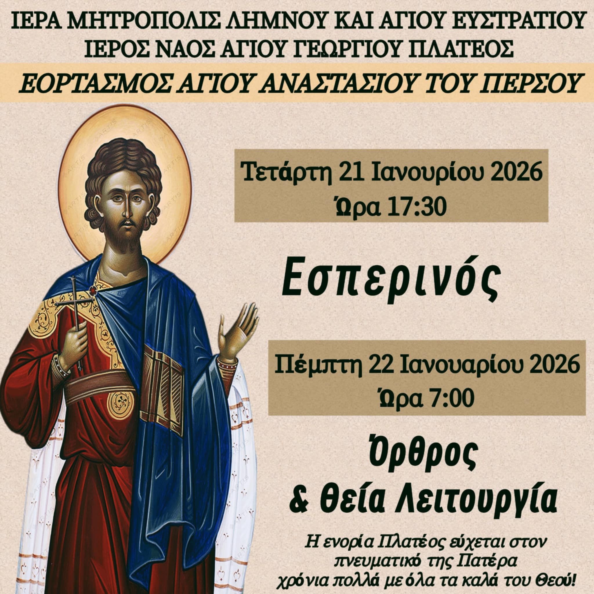 Εορτάσουμε την μνήμη του Αγίου Αναστασίου του Πέρσου, την ημέρα που άγει τα ονομαστήριά του ο εφημέριος και πνευματικός πατέρας της ενορίας Πλατέος.