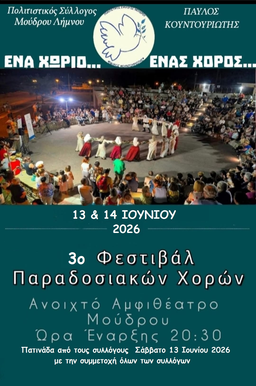 Με χαρά σας ανακοινώνουμε την διεξαγωγή του 3ου Φεστιβάλ παραδοσιακών χορών «Ένα χωριό….ένας χορός» που θα πραγματοποιηθεί κατά το διήμερο 13 & 14 Ιουνίου 2026 στο ανοιχτό αμφιθέατρο Μούδρου.