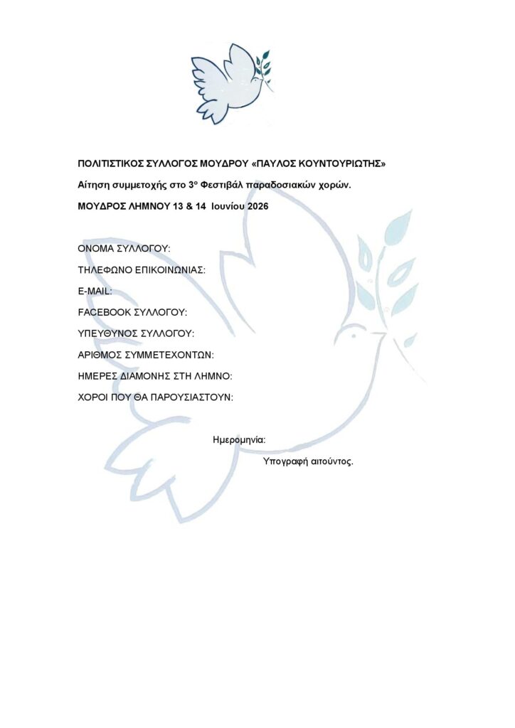 Σας αποστέλλουμε και έντυπο αίτησης για την συμμετοχή σας εάν επιθυμείτε. Υποβολή δηλώσεων-αιτημάτων συμμετοχής μέχρι 10 Μαίου 2026 στο mail του συλλόγου politistikosmoudrou@gmail.com
