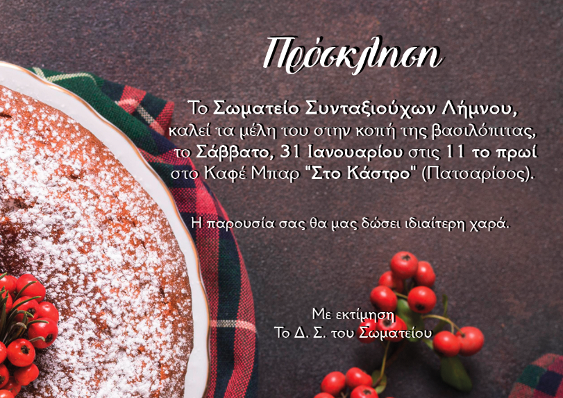 Το Σωματείο Συνταξιούχων Λήμνου θα κόψει την πίτα του το Σάββατο 31 Ιανουαρίου, στις 11 το πρωί “Στο Κάστρο” και καλεί τα μέλη του να παραβρεθούν.