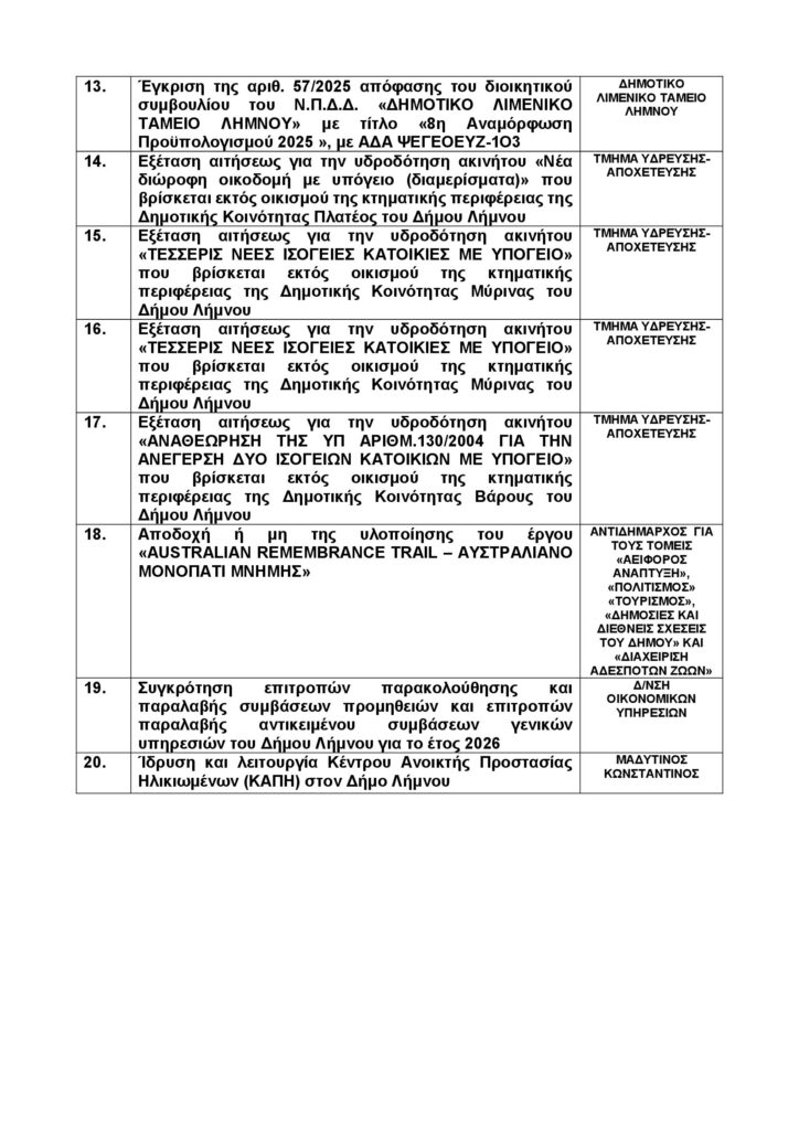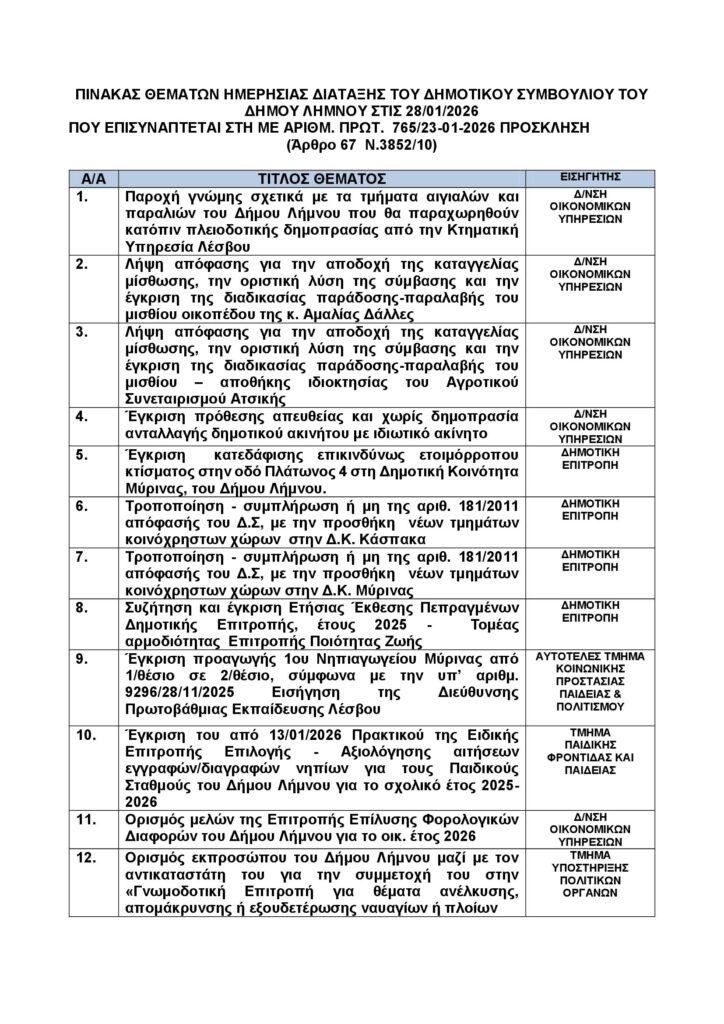 Σας προσκαλούμε να προσέλθετε στη δια ζώσης τακτική συνεδρίαση του Δημοτικού Συμβουλίου, που θα διεξαχθεί στην αίθουσα συνεδριάσεων του Δημοτικού Συμβουλίου Λήμνου, που βρίσκεται στην Πλατεία Υψιπύλης (Πλατεία ΟΤΕ) στο Παπουτσίδειο Δημοτικό Μέγαρο, 1ος όροφος, 04 γραφείο, την 28η του μηνός Ιανουαρίου 2026, ημέρα Τετάρτη και ώρα 17.30, για συζήτηση και λήψη απόφασης στα παρακάτω θέματα.