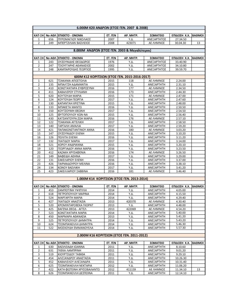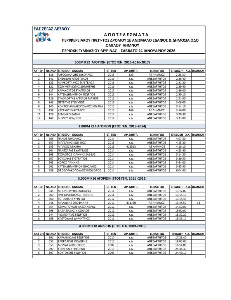 Θέμα: Αποτελέσματα Περιφερειακού Πρωταθλήματος Δρόμου σε Ανώμαλο έδαφος & Δημόσια Οδό – ομίλου Λήμνου 2026.