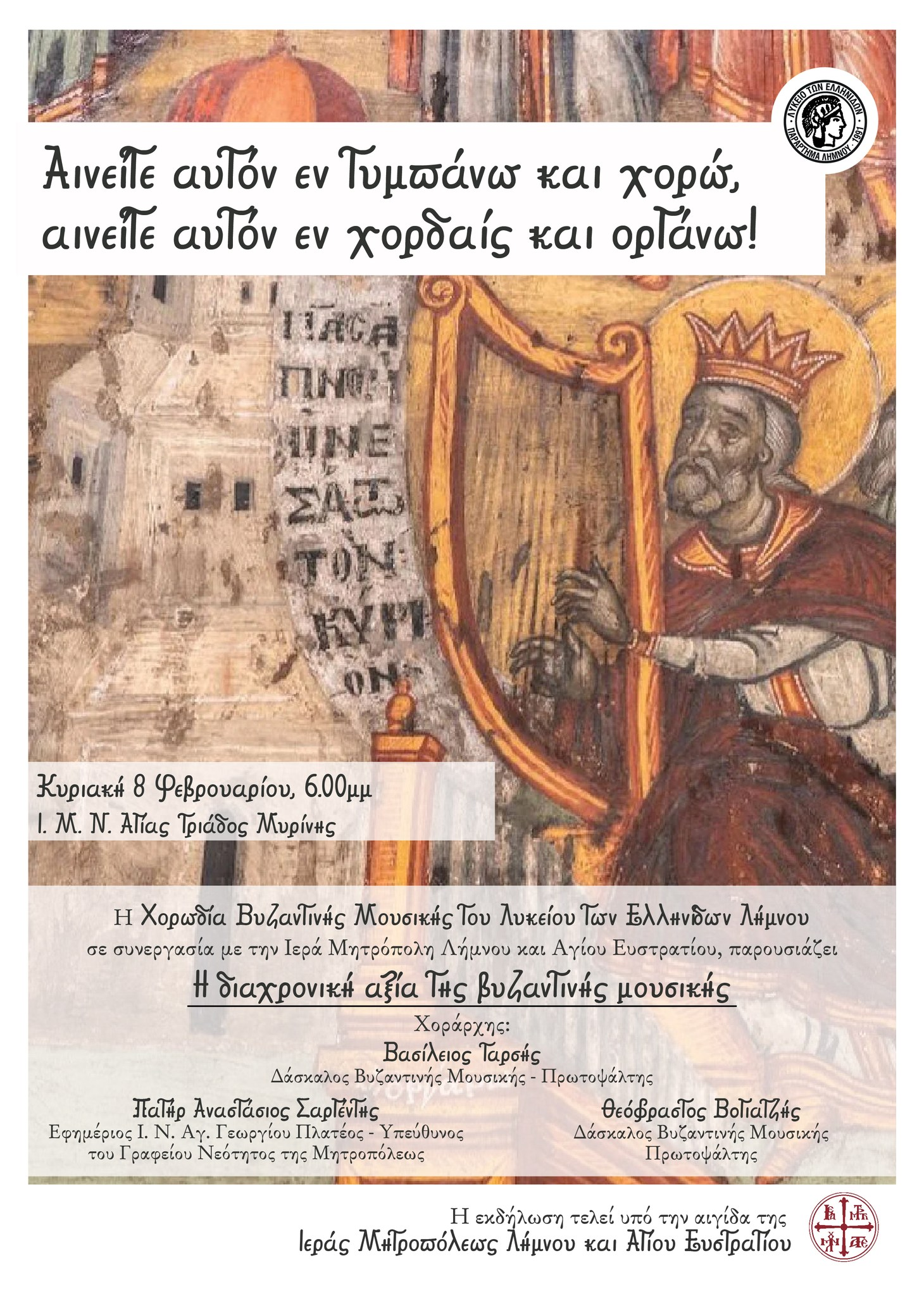 Το Λύκειο των Ελληνίδων Λήμνου και η Ιερά Μητρόπολη Λήμνου & Αγίου Ευστρατίου σας προσκαλούν στην εκδήλωση βυζαντινής μουσικής με τίτλο “Αινείτε αυτόν εν τυμπάνω και χορώ, αινείτε αυτόν εν χορδαίς και οργάνω! – Η διαχρονική αξία της βυζαντινής μουσικής”, η οποία θα πραγματοποιηθεί την Κυριακή 8 Φεβρουαρίου, στις 6.00 μμ, στον Ιερό Μητροπολιτικό Ναό Αγίας Τριάδος Μυρίνης.