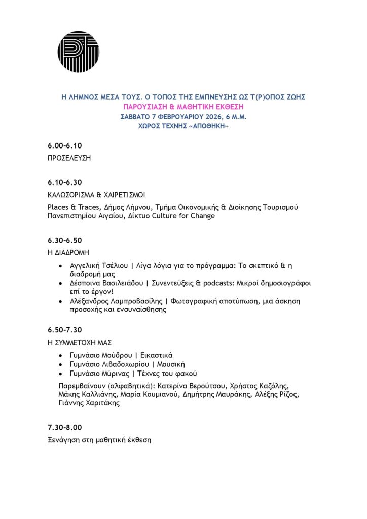 Στις 7 Φεβρουαρίου, το πρόγραμμα θα παρουσιάσουν τα συμμετέχοντα σχολεία και οι συντελεστές. Με παρεμβάσεις θα συμμετέχουν οι προσκεκλημένοι δημιουργοί και, διαδικτυακά, το Τμήμα Οικονομικής & Διοίκησης Τουρισμού Πανεπιστημίου Αιγαίου που συμμετείχε στον σχεδιασμό και τον συντονισμό των Πολιτιστικών Masterplan, και το δίκτυο CultureforChange.