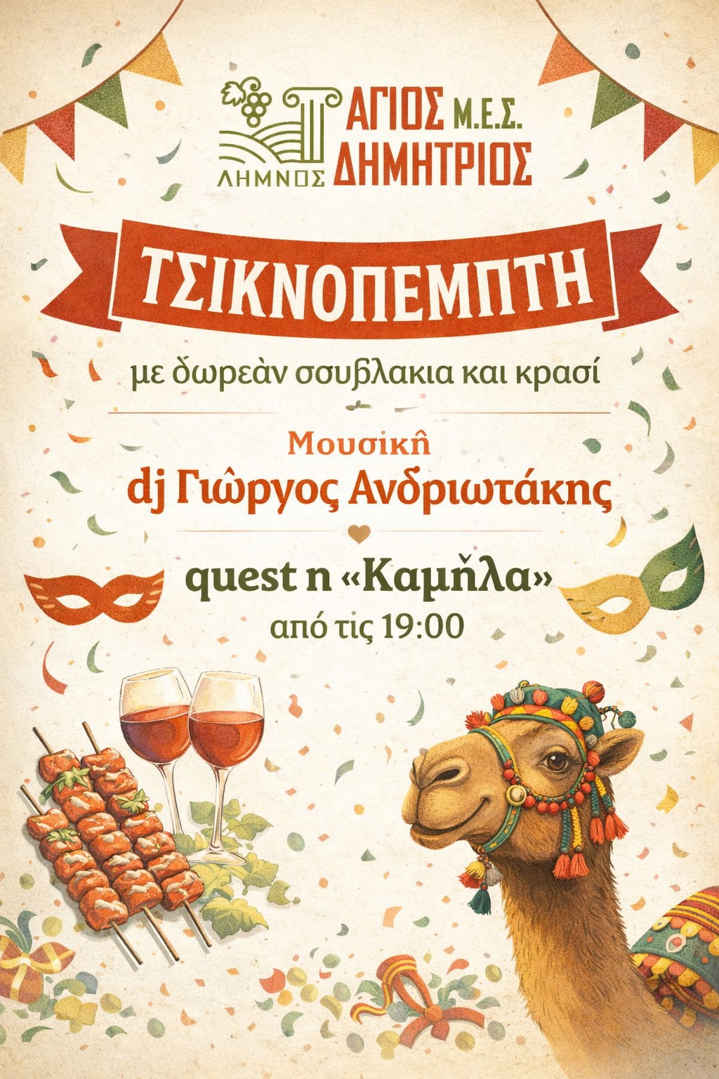 Ο ΜΕΣ “Άγιος Δημήτριος” μας προσκαλεί να αναβιώσουμε το πιο αυθεντικό έθιμο της Αποκριάς σε μια βραδιά γεμάτη παράδοση, γεύσεις και κέφι. Την Πέμπτη 12 Φεβρουαρίου, από τις 19:00 και μετά, το χωριό φοράει τα γιορτινά του και γίνεται μια μεγάλη αγκαλιά για μέλη, φίλους και όλους τους κατοίκους.