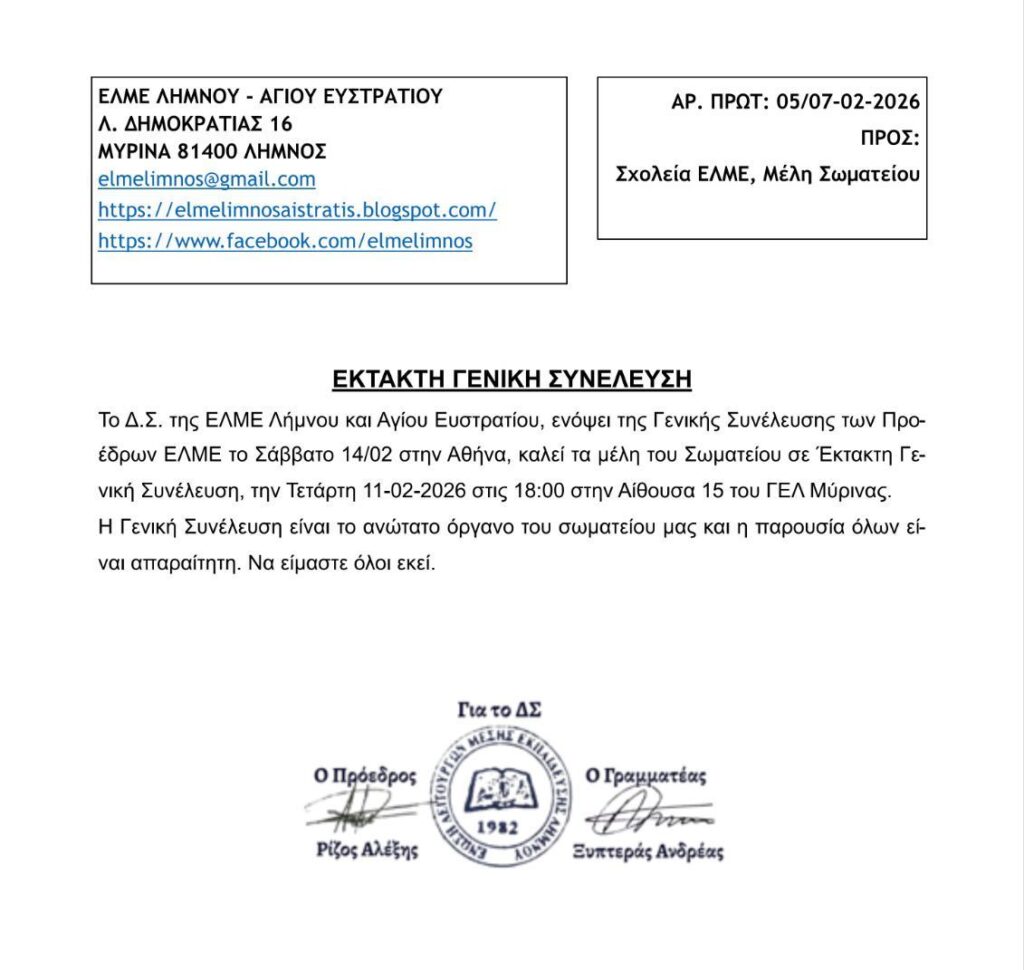 Σε Έκτακτη Γενική Συνέλευση καλεί η ΕΛΜΕ Λήμνου και Αγίου Ευστρατίου την Τετάρτη 11/2 στις 18:00 στο ΓΕΛ Μύρινας.