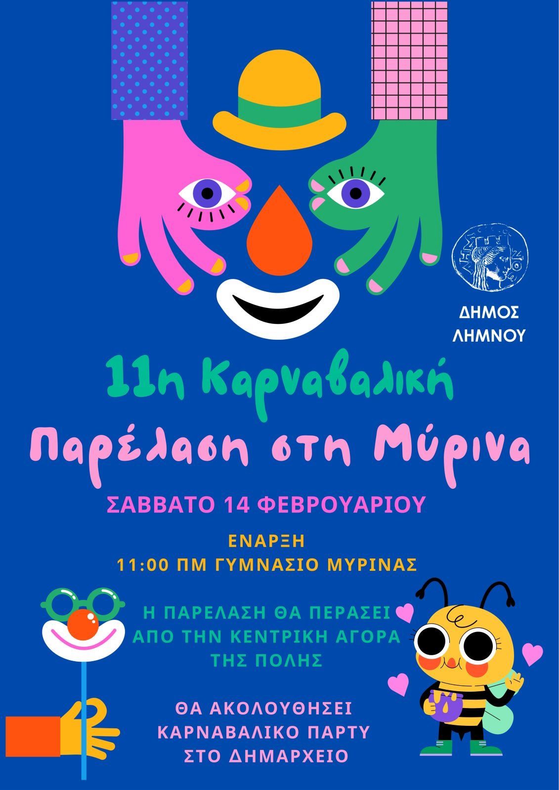 Η Μύρινα φοράει τα αποκριάτικά της και σας περιμένει όλους το Σάββατο 14 Φεβρουαρίου σε μια αποκριά γεμάτη χρώμα, μουσική, χαμόγελα, φαντασία και φυσικά… καρναβαλική διάθεση!
