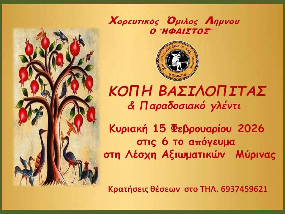 Ο Χορευτικός Όμιλος Λήμνου «Ο ΗΦΑΙΣΤΟΣ», προσκαλεί τα μέλη και τους φίλους του στην καθιερωμένη κοπή της Βασιλόπιτας του,που θα γίνει την Κυριακή 15 Φεβρουαρίου 2026,στη Λέσχη Αξιωματικών Φρουράς Μύρινας.