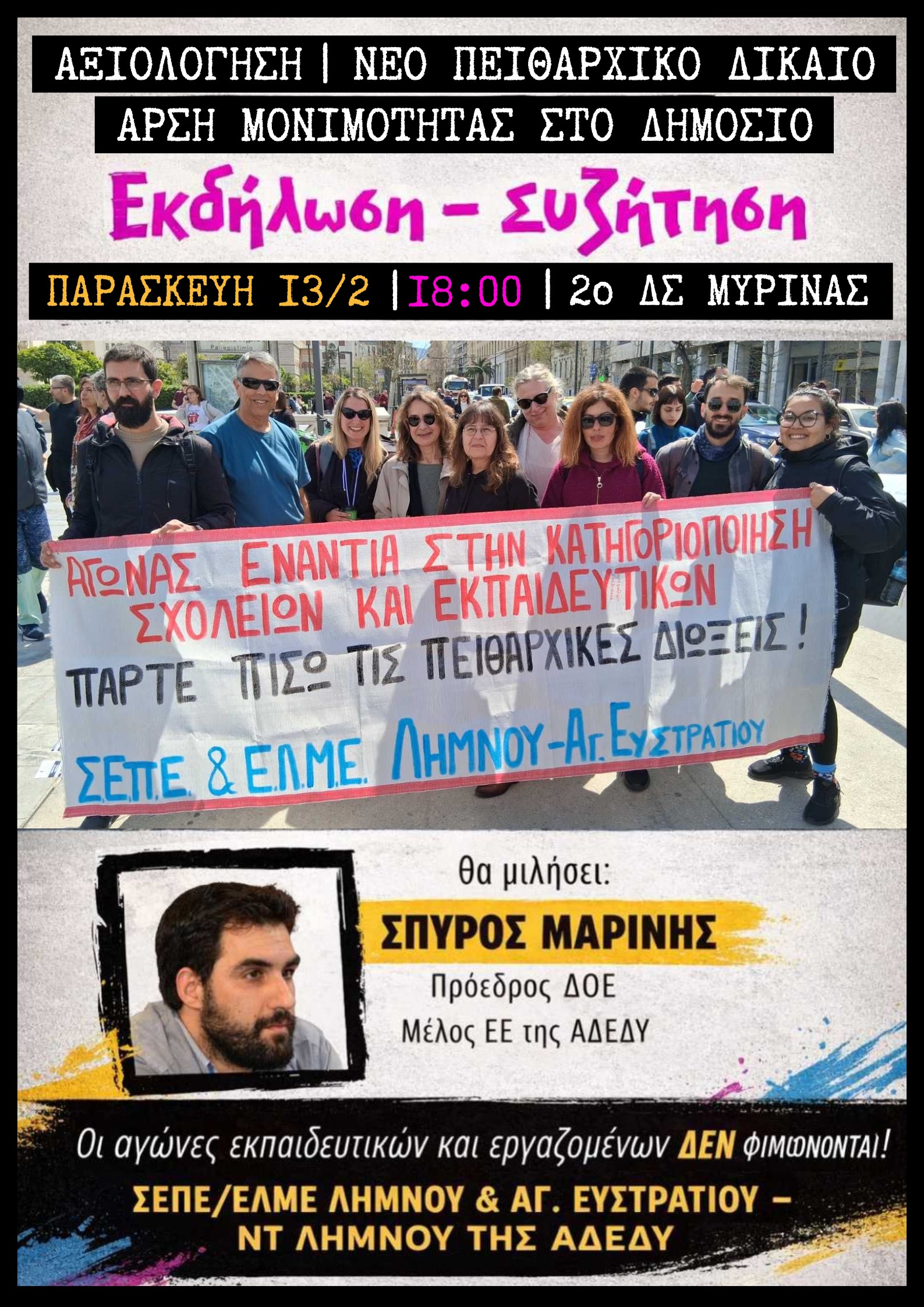 Το Ν.Τ. Λήμνου της ΑΔΕΔΥ, η ΕΛΜΕ Λήμνου & Αγίου Ευστρατίου και ο ΣΕΠΕ Λήμνου σας προσκαλούν στην εκδήλωση – συζήτηση που συνδιοργανώνουν με θέμα: