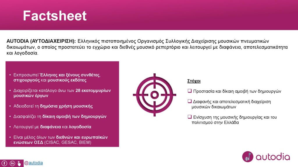 Η AUTODIA, ο ελληνικός Οργανισμός Συλλογικής Διαχείρισης Μουσικών Πνευματικών Δικαιωμάτων, εκπροσωπεί πάνω από 28 εκατομμύρια ελληνικά και ξένα τραγούδια και φροντίζει οι δημιουργοί τους να αμείβονται δίκαια.
